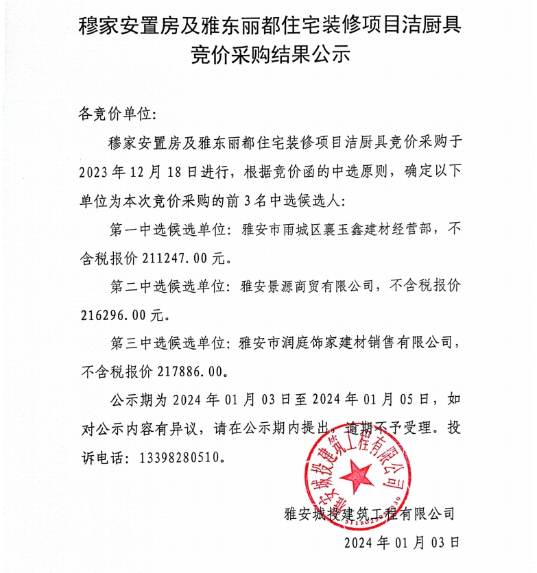 穆家安置房及雅東麗都住宅裝修項目潔廚具競價采購結果公示