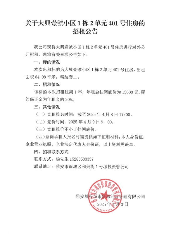 關于大興壹號小區1棟2單元401號住房的招租公告